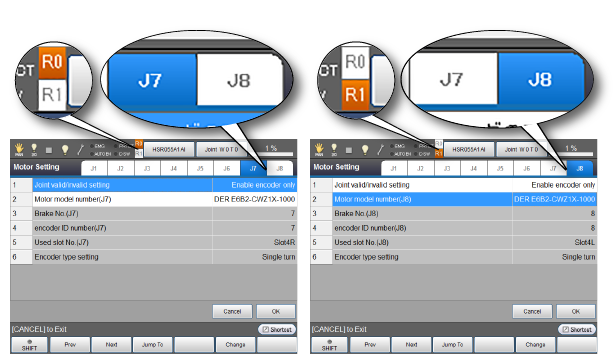 As the figure above, in the [Motor Setting] window, the 7th joint setting is done for Robot0, and the 8th joint setting is done for Robot1.