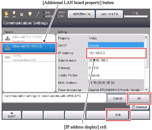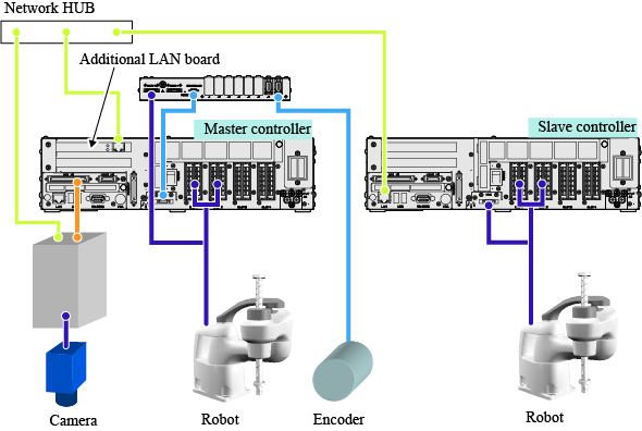 For the robot controller where an additional LAN board is inistalled, you need to perform [Multicast. I/F [IP Address]] setting. In the figure above, the LAN board is installed in the master controller, therefore, this setting is done for the master controller. If the LAN board is installed in the slave controller, do this settitng for the slave controller.