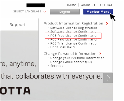 Select [Member Menu] - [RC8 Free License Confirmation].