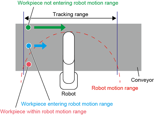 TrackMotionRange command can check whether there is any point entering the robot motion range, on the path of the target position of the robot task motion when the tracking-target work is within the tracking range.