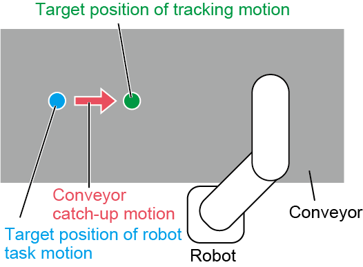 In actual, the conveyor is working, therefore the position synthesized the conveyor catch-up motion from the target position of the robot task motion is the target position of the tracking motion.
