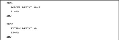 List 3(PRO1 and PRO2 are in different folders)DescriptionPRO1FOLDER DEFINT AAENDList 3 is correct in defining FOLDER variables AA. These variables have the same name but are defined in different folders so that they are treated as different ones.PRO2FOLDER DEFINT AAEND