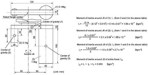 When calculating the moment of inertia around J4, J5 and J6 of the end-effector, use the formulas given in following Table and Figure.