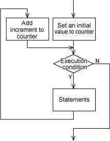 Initial value is assigned to the variable designated in counter to judge the execution condition. If the execution condition is True, the designated set of statements is executed. A value designated in increment is add to the counter variable every time a set of statements is executed.