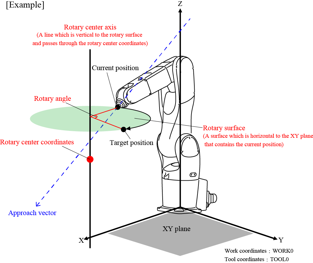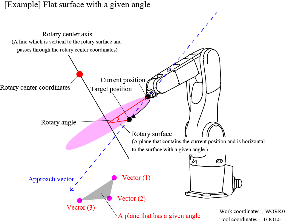 | A plane with a given angle | Specify a coordinate on the current Tool coordinate system. | Omittable. If the plane is not specified, the first point (vector 1) on the given rotary surface that is expressed by the vector type data will be the rotary center coordinate. |