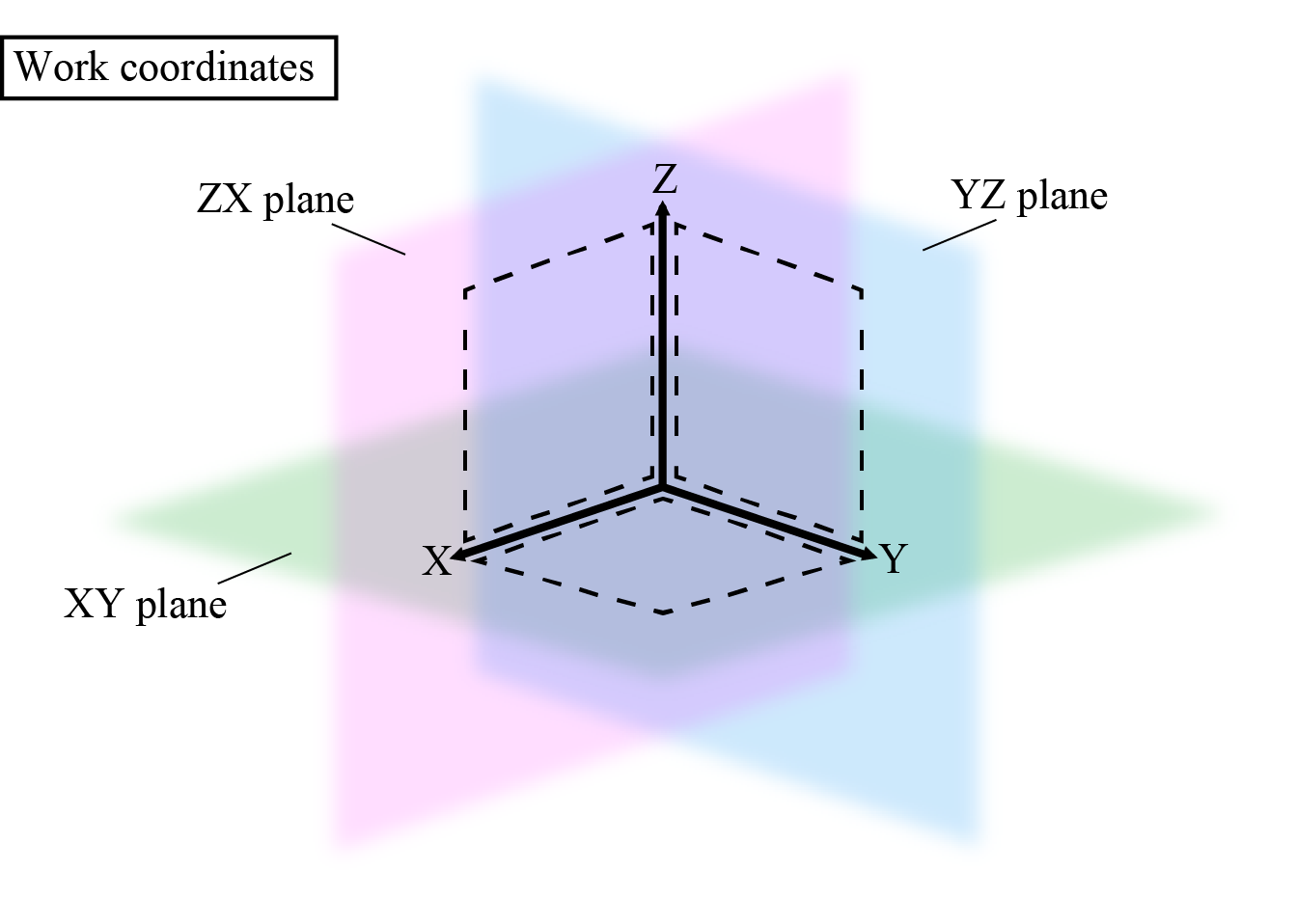 - With the three axes (X, Y, and Z axis) on the current Work coordinate system, assume that a plane that consists of two of these axes is called a Plane A. The rotary surface is a plane which contains the current position and is horizontal to the Plane A.