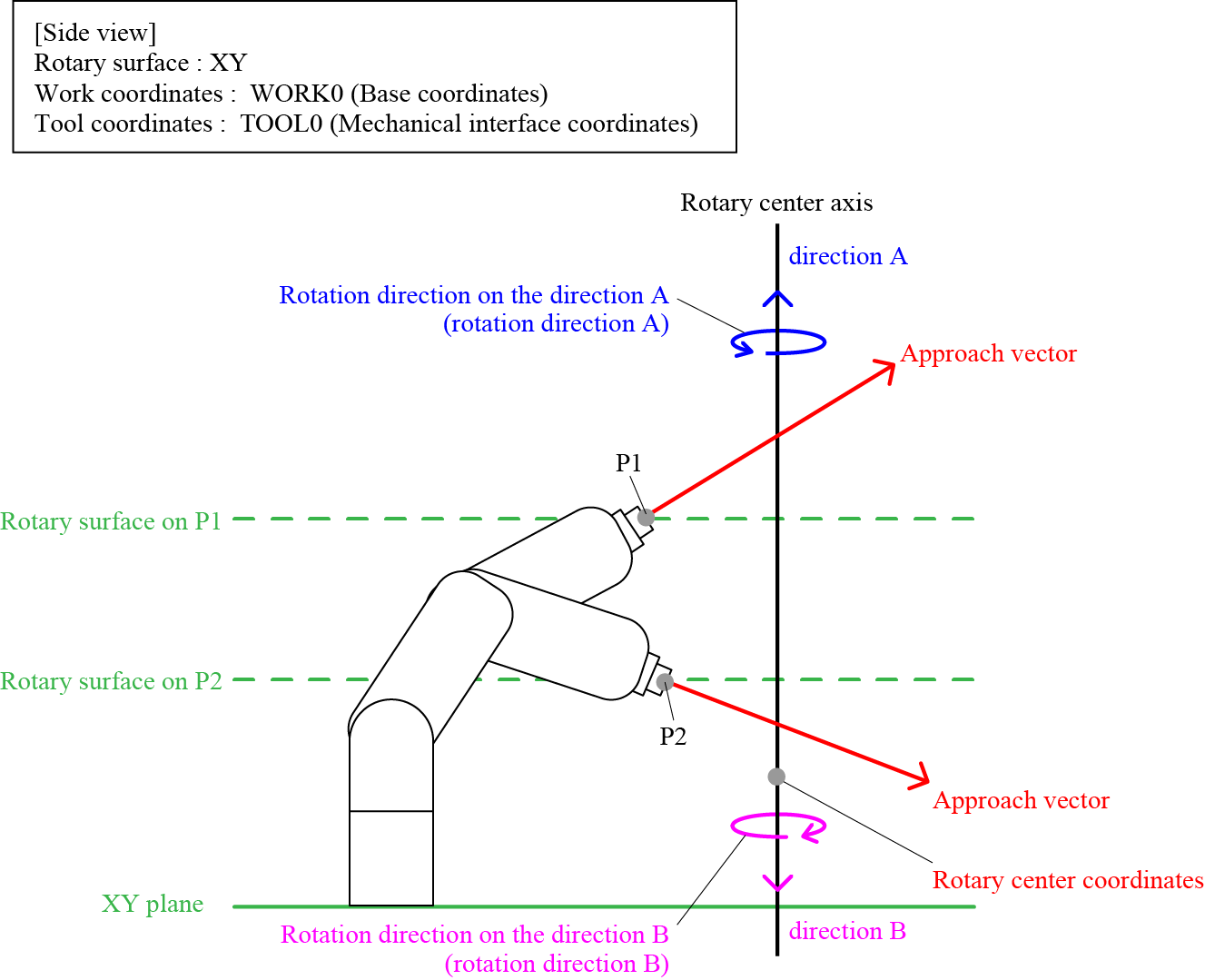 In this case, if the current position is P1, the rotation direction is the rotation direction A because the approach vector faces to the direction A, viewing from the rotary surface P1.