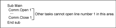 | (1)When the line number 1 opens, a program stops without Comm.Close or, a program stops incorrectly. | (2)CPU usage is saved when the same or other programs open the line number 1 again. |