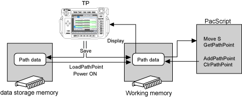 The controller is equipped with two types of memory: data storage memory which holds data when power is off, and working memory which does not hold any data. When the controller is powered ON, all path data stored in the data storage memory is read into the working memory.