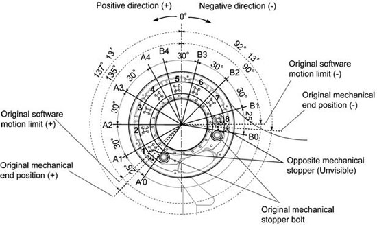 A0 <Original mechanical end position> +137° 13' <Original software motion limit> +135° |