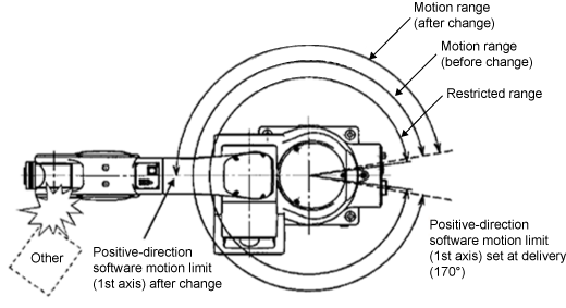 If the robot interferes with any other device, change the software motion limits to make the motion space smaller as shown by the upper figure on this page. If the air piping or wiring of the end-effector becomes taut as the robot runs, change the software motion limits to make the motion space smaller as shown by the lower figure on this page.