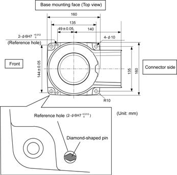 - Drill four bolt holes (M8) 20-mm deep or more, and two dowel pin holes (φ4, H7 for diamond shaped pin, and φ6H7 for internally threaded positioning pin) 10-mm deep or more in the robot mounting position where the robot unit is to be secured, according to the dimension in the figure below.