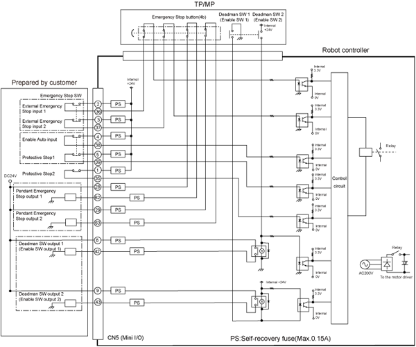 The following figure shows the example of configuration and connection of emergency stop circuit on the standard type of the controller. In the RC7M controller, the emergency stop circuit consists of dual safety circuits.