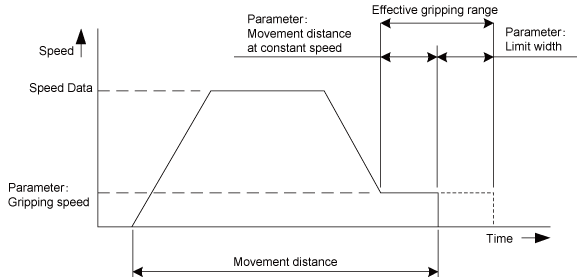 In the Accelerated/Decelerated Relative Movement and Grip mode, the fingers can move until they almost gets to the position specified as a current position utilizing trapezoidal speed control. The gripping force specified in parameter becomes valid.