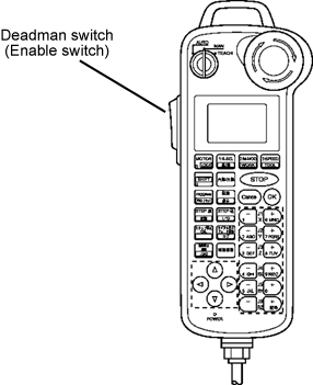 The deadman switch is provided to stop the robot automatically and safely when the operator can no longer operate the robot correctly due to unforeseen circumstances such as the operator suffering a blackout or dying while running the robot manually with the teach pendant. If a situation such as this arises, the strength with which the operator is pressing the deadman switch will either decrease or increase markedly. The deadman switch is a 3-position switch which is able to recognize and react to the following 3 operating statuses.