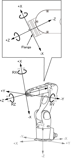 Pressing the X, Y, or Z key in the Tool mode moves the robot flange linearly along the X, Y, or Z axis, respectively, as shown below.