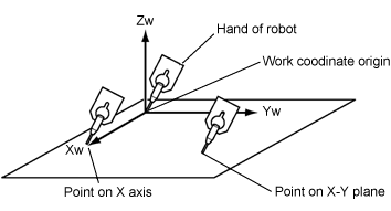 In this method coordinates are created by teaching three points, namely, the origin of work coordinates, a point on X-axis and a point on X-Y plane.