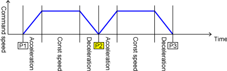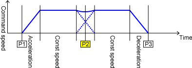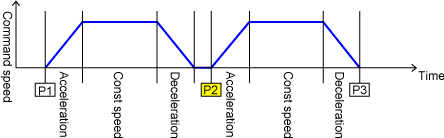 The pass motion starts the next acceleration motion during deceleration time before it reaches P2 as shown below. Therefore, the execution time is shorter than the end motion, which executes deceleration and acceleration individually.