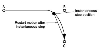 If an instantaneous stop is executed during deceleration of the pass motion and the motion is restarted, the robot moves to the position of the next step command value. Therefore, exercise due care if speed, acceleration, and deceleration are low.