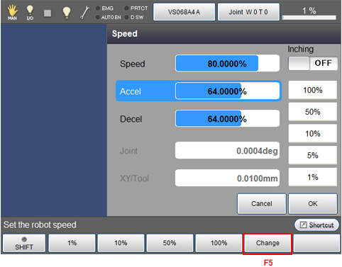 The screen of teach pendant is back to the basic screen. Please make sure that the displayed speed of the right side of status bar is updated to the speed that is set by following the above procedures.