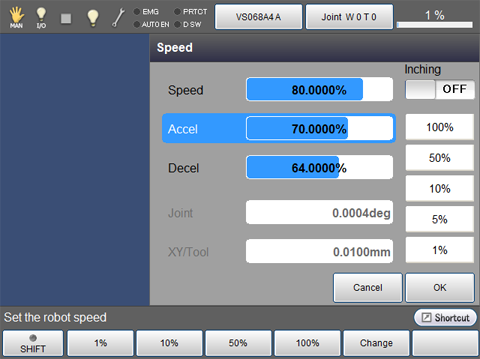 - The minimum tolerance for the setting is 0.1%, and the respective external acceleration and external deceleration are 0.0001%. If external speed of 1% or less is set, the displayed speed of bar graph on the status bar of teach pendant or mini-pendant will be 1%.