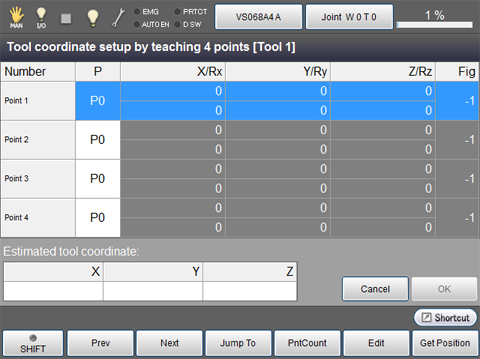 Press [F4 Easy Edit] to display the following [Tool coordinate setup by teaching * points] window.(The example of teaching 4 points are given in the figure.)