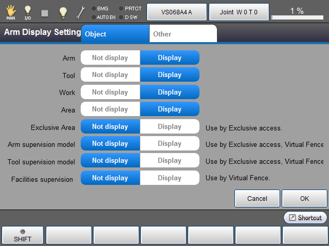 You can change the options of [Exclusive Area], [Arm supervision model], [Tool supervision model], and [Facilities supervision] when the exclusive control or virtual fence license is enabled.