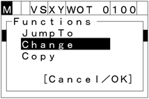 NOTE: There are two types of "Function" screens. For I, F, D, and V variables, three items (JumpTo, Change, and Copy) will display; for P, J, and T variables, five items (JumpTo, Move, Change, GetPos, and Copy) will display.