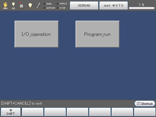 The following example illustrates the procedure for creating two buttons: one (labeled "I/O operation") that turns I/O variable #24 on as long as it is pressed and another (labeled "Program_run") that runs a program (Sample pro).