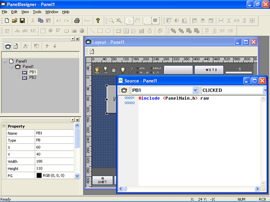 Start by adding action source code to turn I/O variable #24 on when the button is pressed. Selecting the combination PB1 and CLICKED from the Part and Event list boxes at the top of the Source Code Edit window automatically generates the corresponding 3-line action source code block skeleton on the editor screen.