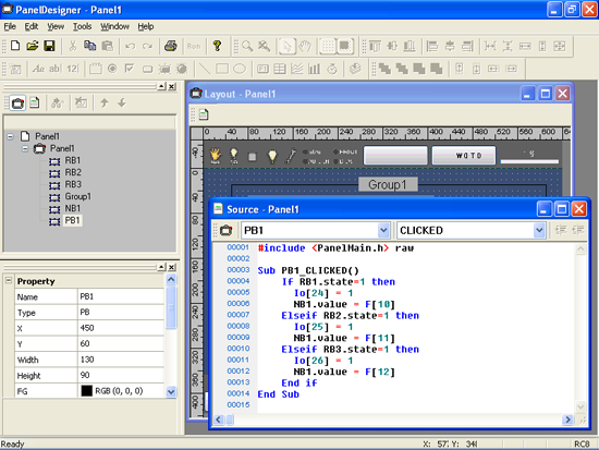 Open the Source Code Edit window, select PB1 and CLICKED to create the action source code skeleton, and add the following IF statement branching on the radio button properties (.state).