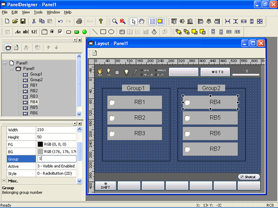 Set the property group for all radio buttons to the group number for the group to which they belong to ensure mutually exclusive operation within the group.