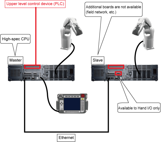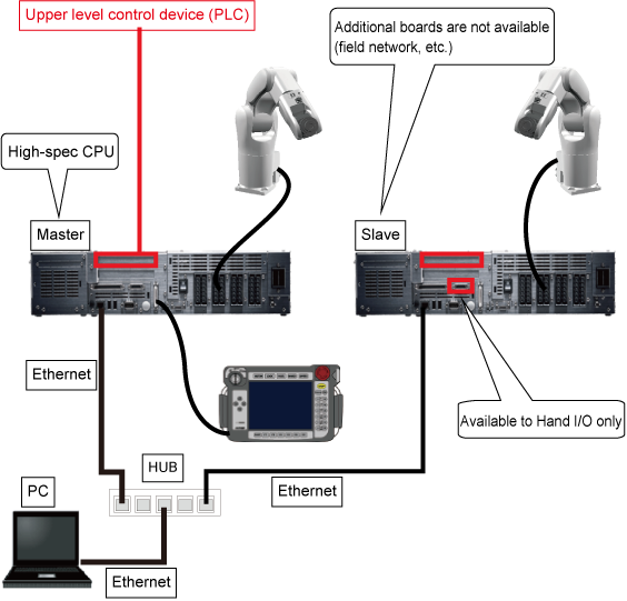 On both of the master and slave controllers, the connection methods of robot axes and/or extended-joints are the same as that of for a solely-running robot.