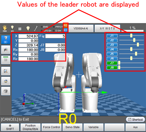 Before operating the robots with the cooperative motion manually, you need to change the move mode and to specify robot to the reader and the other to the follower.