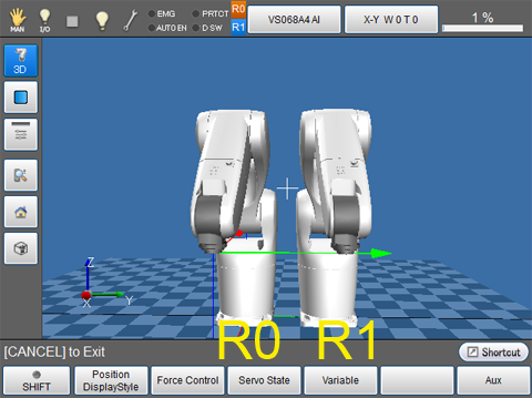 To move the leader robot to the +Y direction, with the deadman switch on the teach pendant pressed, on the Arm traverse key area, press "+" button on the J2/Y.