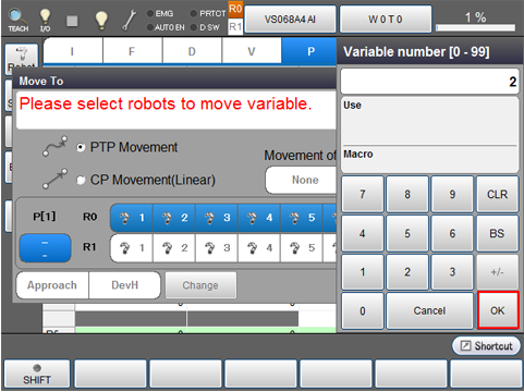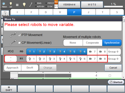 When you press "DevH", a dialog box appears. Enter given coordinate values (X, Y, Z, Rx, Ry, and Rz) and press OK. All robots will offset by specified distances from the position specified by variable.