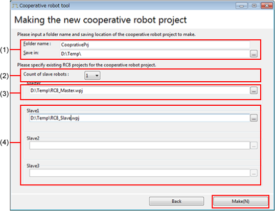 Create a new robot project for cooperative control function operation from an existing WINCAPSIII project for both the master and slave robot, respectively.
