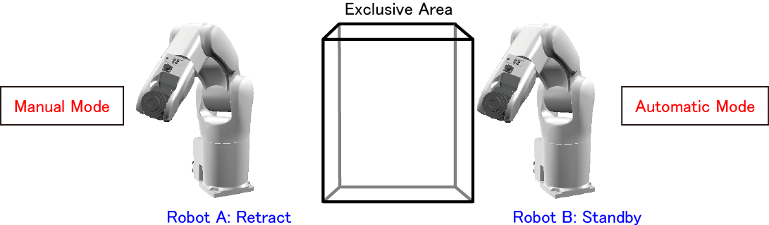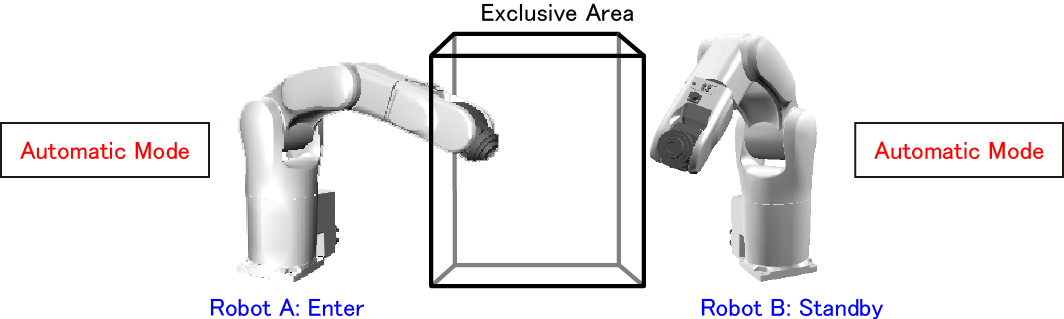 This function prevents a robot from entering an exclusive area if another robot already exists in the area. If a robot is going to enter an exclusive area while another robot is working there, a robot outside the area will start deceleration or stop its motion so as not to enter the exclusive area.