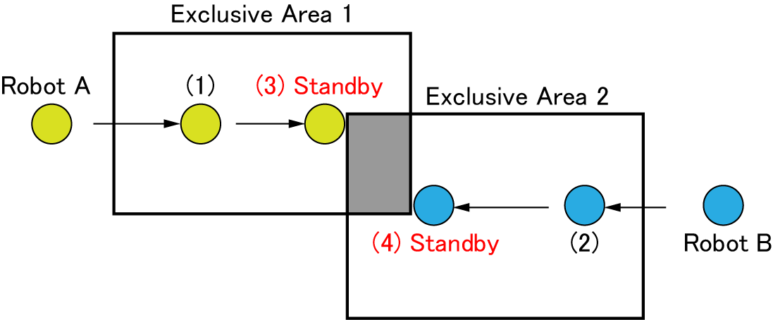 (3) Robot A tries to enter Exclusive Area 2. However, since Robot B exists in the area, Robot A becomes waiting.