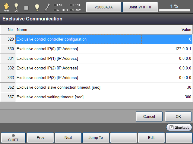 | 367 | Exclusive control waiting timeout [sec] | sec | 300 | Specify the upper limit of the time for the robot to wait during exclusive control. If the waiting time exceeds the specified value, the error [0x83201567:Exclusive control wait timeout.] occurs. |