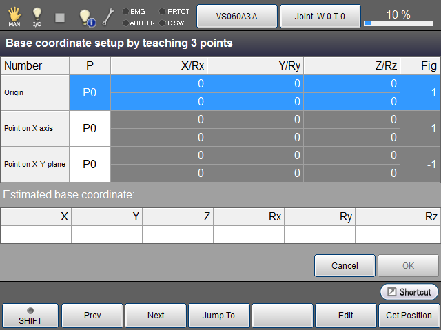 Before performing the base definition, perform the teaching for arbitrary three points (an origin point, a point in the X-axis direction, and a point on the X-Y plane) as reference points and then register them to the position coordinates (P-type variables). Perform the base definition based on these data.