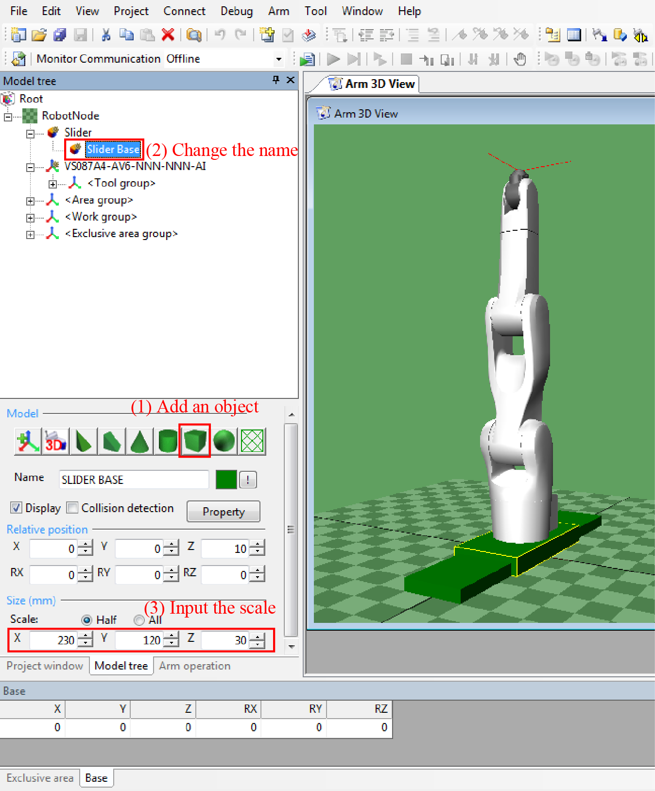 Press [Move arm node] to move the robot model to below the SliderBase.