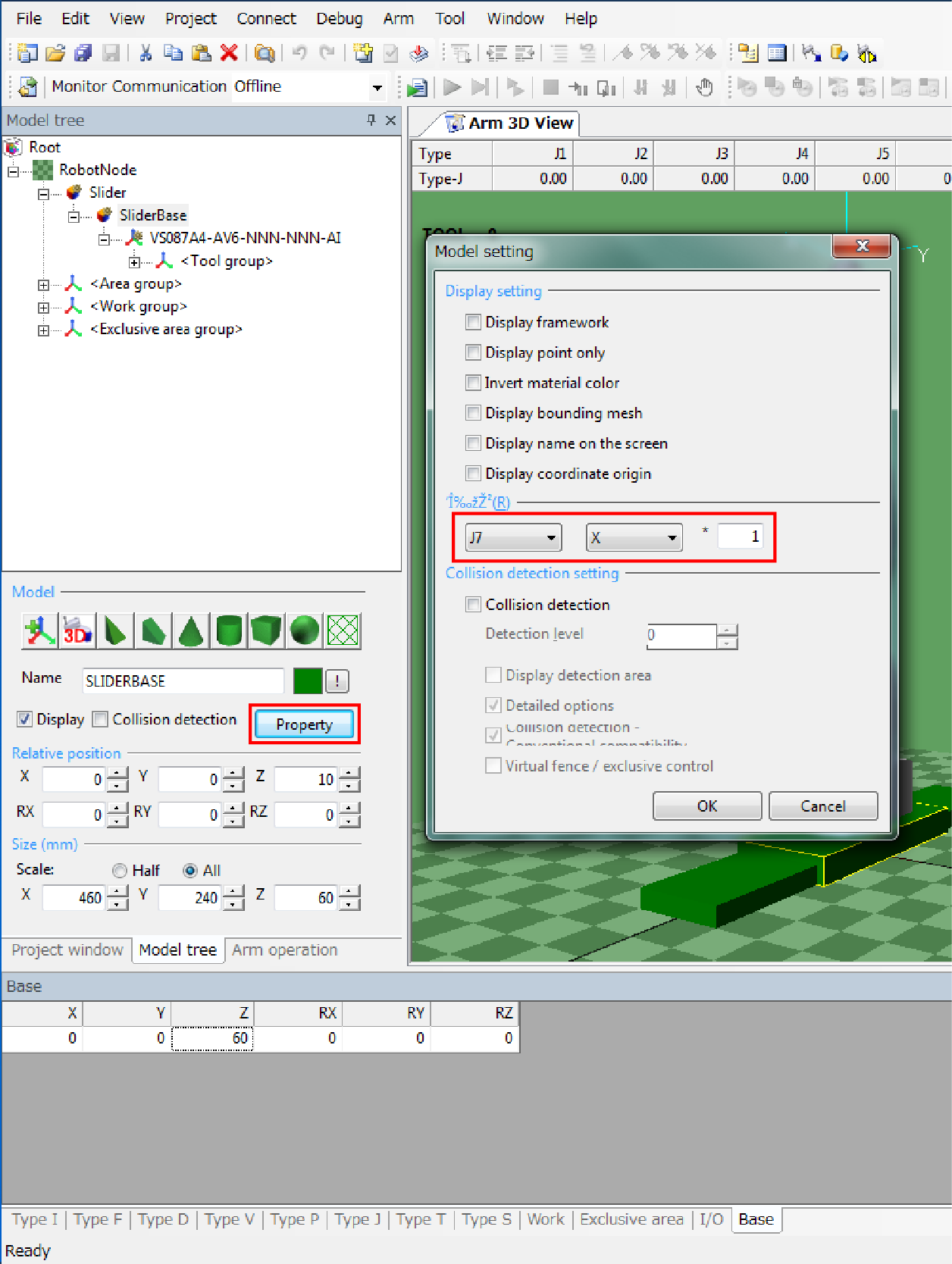 Select an axis you want to link, click [Property] to open [Model setting] window, and then configure [Related axis]. In this sample, specify J7-axis to move in the X-axis direction.