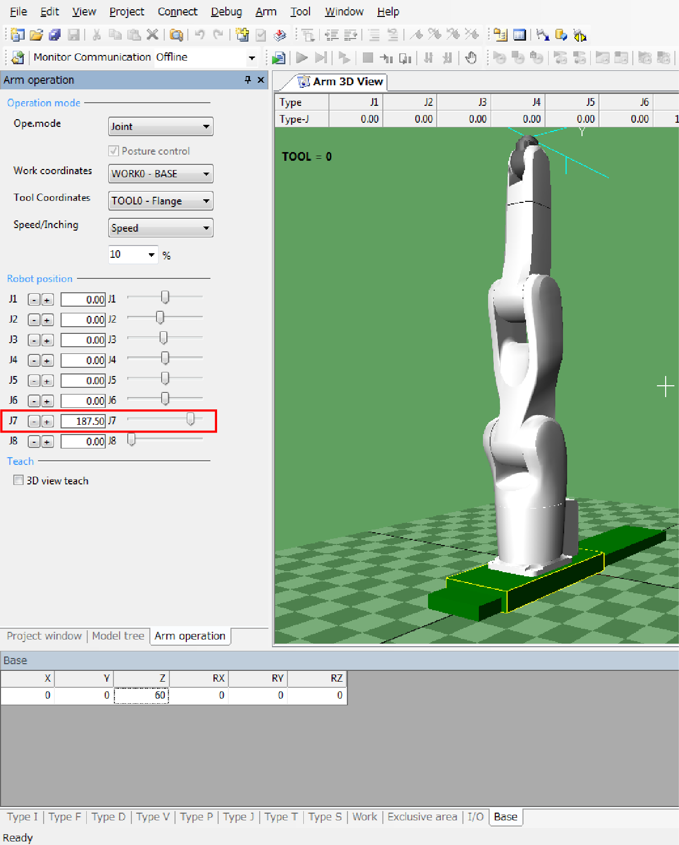 Select Arm operation tab. With J7-axis slider in Robot position area, check the J7-axis behavior. This completes the travel shaft setting.