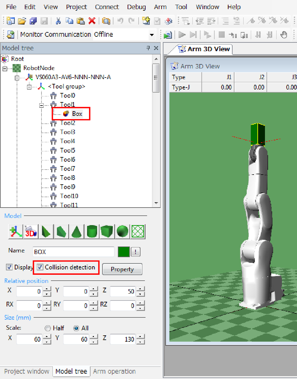Monitoring model data is sent together with exclusive area data. To create exclusive area data with the teach pendant or program, send monitoring model data to the controller in this step.