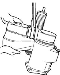 When unpacked, the overhead-mount robot unit is fastened with rope as shown below. Make sure that the robot's 2nd-axis arm cannot rotate.
