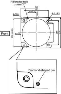 According to the dimensions specified in the figure below, drill four robot fixing holes and two dowel pin holes in the robot mount where the robot unit is to be anchored.