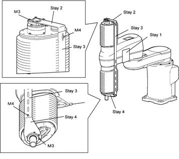 When preparing stays for clamping wiring and piping to the robot unit, refer to Stay 1 through Stay 4 shown below.