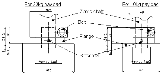 The flange kit consists of a flange, fixing bolt, and setscrew. Install the flange to the T-axis shaft.