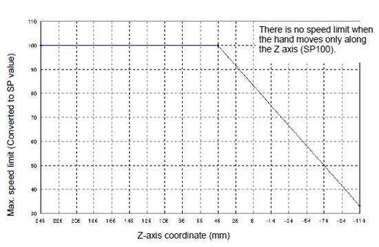 For example, when the robot arm moves by SP100 from the start point (Z-axis coordinate 26 mm) to the target point (Z-axis coordinated -74 mm), the maximum speed limits are as follows: